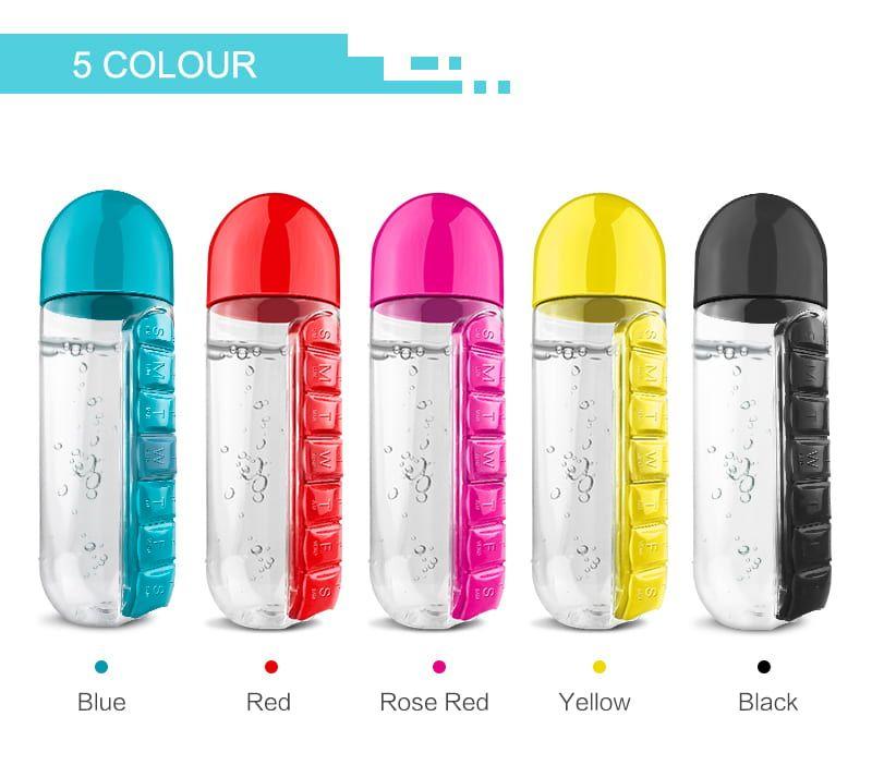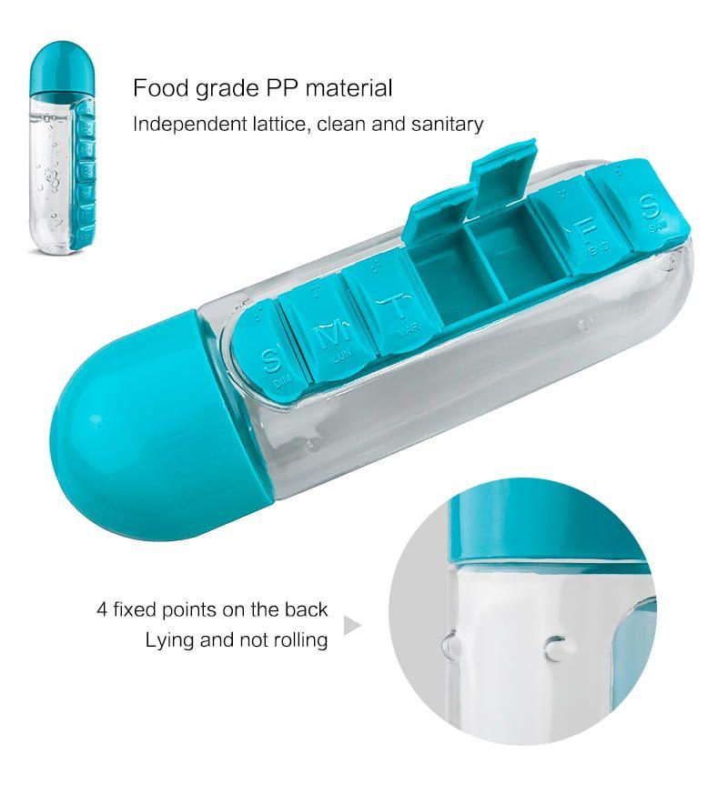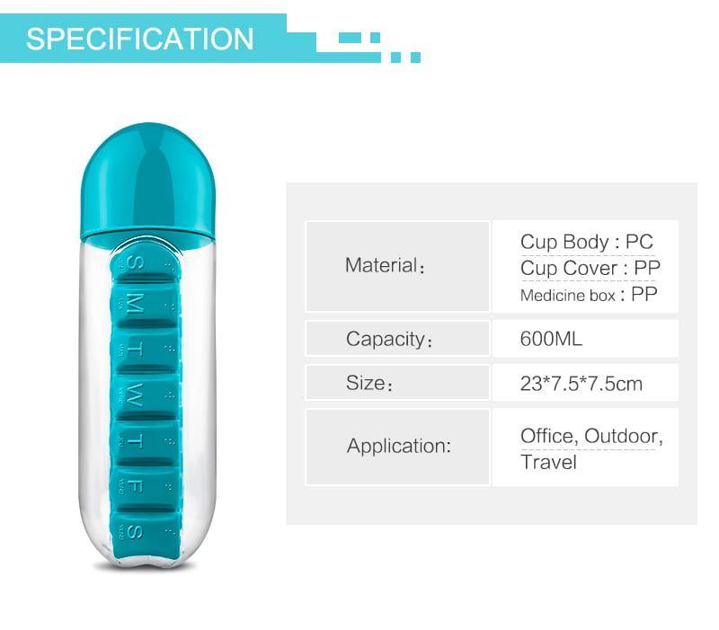 600ml Sports Plastic Water Bottle Combine Daily Pill Boxes Organizer Drinking Bottles Leak-Proof Bottle Tumbler Outdoor Product Description: New material eco-friendly storage with BPA There are 7 pill boxes on the bottle which can carry some pills if necessary. Good for hiking or outdoor camping and so on Spray perfect combination with drink. Resistant to slam cup body is grade polycarbonate. Specification: Material: PP+PC (BPA ) Gross Weight(about) : 150g Capacity: 600ml Size(about): 8cm x23.5m Package Included: 1* Sport Water Bottle Note: It is manual measurement, there may be 1-2cm error. Thank you! Due to lighting effect and computer color, the actual colors may be slightly different from the picture.